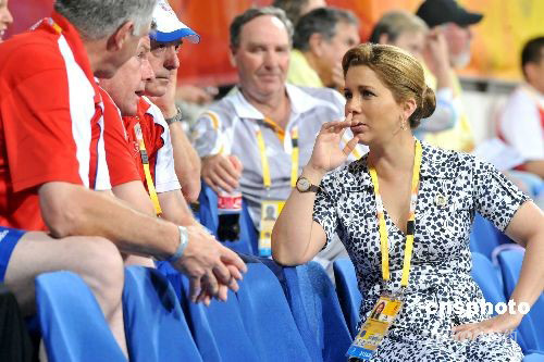 八月九日晚,北京奥运马术项目在香港沙田赛场举行盛装舞步赛事,国际马术联合会主席、约旦公主哈雅到场观赛,并与参赛队伍职员在看台上交谈。中新社发 邓庆乐 摄