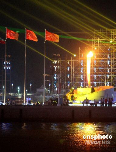 第29届奥林匹运动会帆船比赛启动仪式8月9日晚在青岛举行,由香港退役运动员李丽珊点燃的火炬在奥帆中心熊熊燃烧,成为青岛一景。中新社发 赵振清 摄