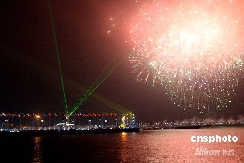 第29届奥林匹运动会帆船比赛启动仪式8月9日晚在青岛举行,绚丽多彩的烟花映亮奥帆中心。中新社发 赵振清 摄