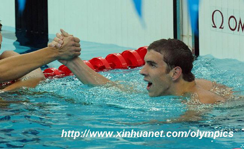 8月10日,美国选手菲尔普斯(右)赛后接受祝贺,他在男子400米个人混合泳决赛中,以4分03秒84的成绩获得冠军,并打破世界纪录。这是北京奥运会首枚游泳比赛金牌。 新华社记者陈凯摄