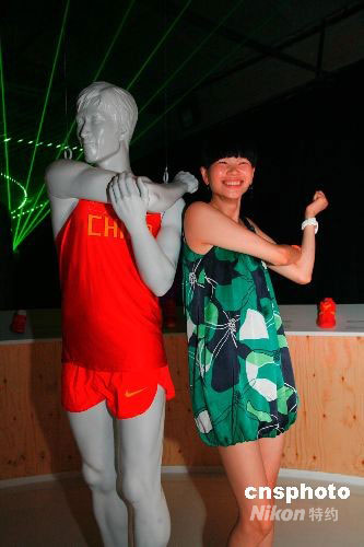 8月9日晚,胡海泉、吕燕、春晓、瞿颖等饶有兴致地参观了中国队装备展览,并为中国健儿加油助威。中新社发 沈晨 摄