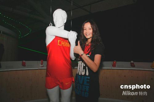 图为著名模特瞿颖与体育健儿雕塑合影。 中新社发 沈晨 摄