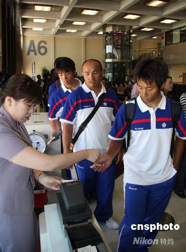 中华台北棒球队三十人于八月十日上午十时四十分,乘班机离台赴北京参加奥运会。图为队员在登机口验票。 中新社发 曾嘉 摄
