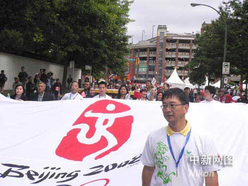 加拿大联邦国会议员杜新志(后排左二)等名流手持印有大红“中国印”的巨幅北京奥运会会旗在温哥华唐人街游行为北京喝彩。吕振亚摄