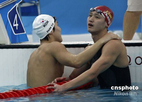 8月10日,北京奥运会游泳项目男子400米自由泳决赛上午在水立方举行,韩国选手朴泰桓以3分41秒86获得金牌,中国选手张琳(右)以3分42秒44获得银牌,图为二人互相致贺。中新社发 杜洋 摄