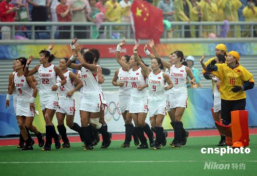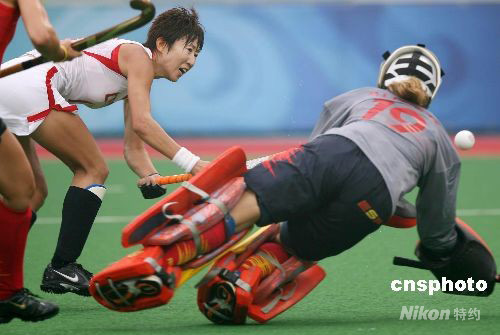 8月10日,中国女曲在奥运会女子曲棍球小组赛首场比赛中以3:0战胜西班牙队。图为中国队在进攻中。 中新社发 武仲林 摄