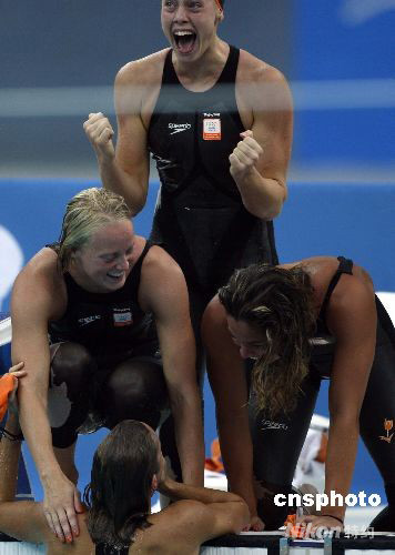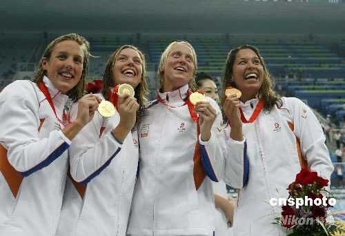 8月10日上午,刚刚在今年3月创造女子4×100米自由泳接力世界纪录的荷兰队,以3分33秒76获得北京奥运会游泳比赛第一个接力项目金牌,并打破了这个项目的奥运会纪录。奥运会和世锦赛“双料”冠军澳大利亚队只获得铜牌,成绩是3分35秒05。由41岁老将达·托里斯领衔的美国队获得第二名。中新社发 杜洋 摄
