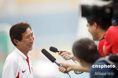 8月10日,中国女曲在奥运会女子曲棍球小组赛首场比赛中以3:0战胜西班牙队。图为中国队主教练金昶伯赛后笑逐颜开。 中新社发 武仲林 摄