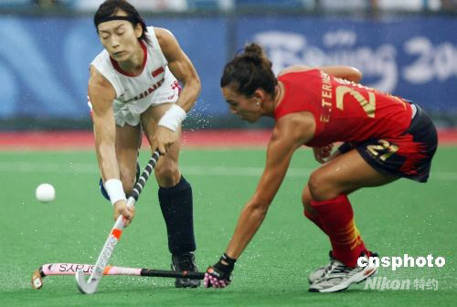 8月10日,中国女曲在北京奥运会女子曲棍球小组赛首场比赛中以3:0战胜西班牙队。图为双方球员展开激烈争夺。中新社发 武仲林 摄