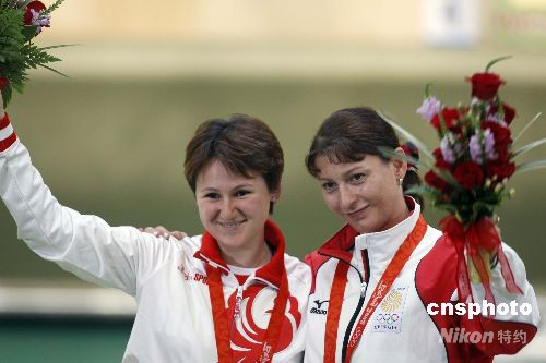 8月10日,北京奥运会女子10米气手枪决赛在北京射击馆落下帷幕,中国选手郭文珺以492.3环勇夺金牌,俄罗斯选手纳塔利娅·帕杰林娜总分489.1环位列第二获得银牌,格鲁吉亚老将妮诺·萨卢克瓦泽以487.4环的成绩夺得铜牌。 图为帕杰林娜(左)与萨卢克瓦泽在领奖台上亲密合影。 中新社发 盛佳鹏 摄