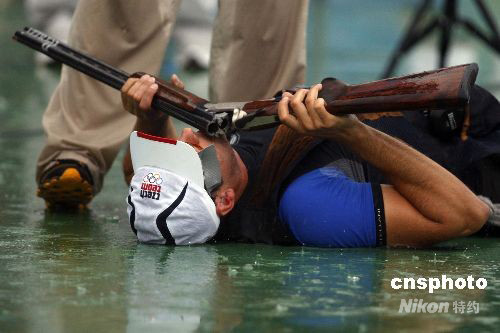 夺冠后科斯特莱茨基躺在雨水中亲吻自己的爱枪欢庆胜利。