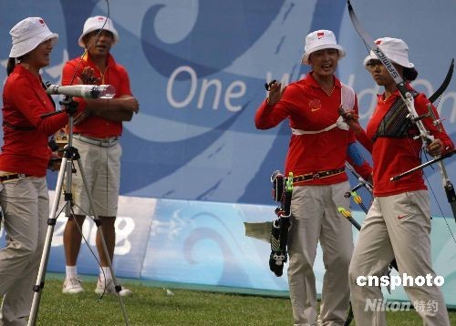 8月10日下午,由张娟娟、陈玲、郭丹组成的中国女子射箭队在女子团体比赛半决赛中战胜英国队,将向多年来位居世界霸主地位的韩国队发起挑战。中新社发 任晨鸣 摄