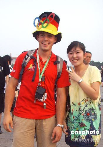 8月9日,几名参加北京奥运会的德国运动员来到天安门广场游览,其中一位运动员头戴的“奥运五环”帽十分独特醒目,引得周围的游客竟相与他拍照合影。中新社发 玉龙 摄