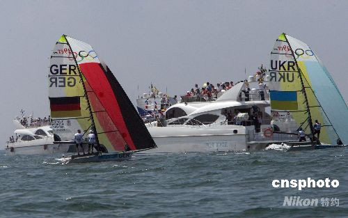 北京2008奥运帆船比赛8月10日继续在青岛举行,观众乘豪华游船近距离观看比赛。 中新社发 赵振清 摄