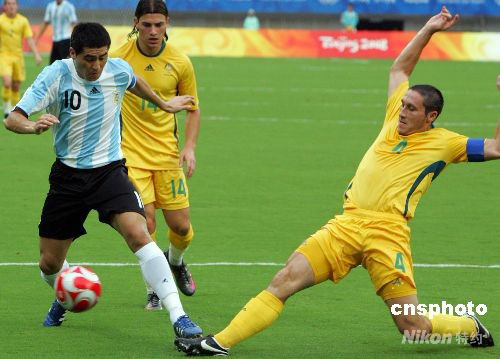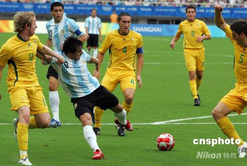 8月10日,北京奥运会上海足球分赛场男足小组赛A组第二轮,阿根廷VS澳大利亚的比赛在上海体育场进行,最终,阿根廷队以1:0战胜澳大利亚迎来二连胜,率先从小组出线。 中新社发 汤彦俊 摄