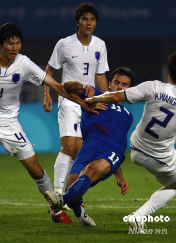 8月10日,北京奥运男足预赛,意大利对韩国的比赛在秦皇岛奥体中心举行,上半场意大利2:0领先韩国队。图为意大利队11号朱塞佩·罗西首先攻破韩国大门。 中新社发 刘新 摄