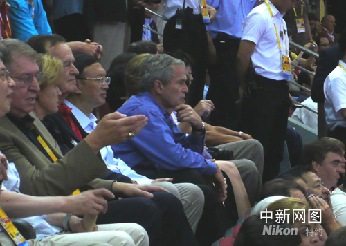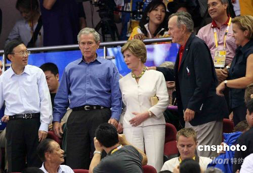 8月10日晚,北京奥运会男子篮球中国队与美国“梦八队”之战在五棵松篮球馆举行,美国总统布什夫妇、老布什夫妇在中国外长杨洁篪陪同下与爆满的观众共同观看比赛。 中新社记者 宋方灿摄