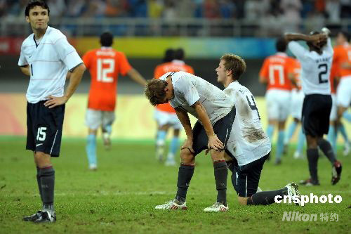 8月10日晚奥运男足天津赛区,美国迎战荷兰队,双方最后以2:2战平。图为美国队员遗憾没守住最后3分钟被荷兰队逼平。中新社发 陈文 摄