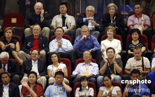 8月10日晚,北京奥运会男子篮球中国队与美国“梦八队”之战在五棵松篮球馆举行,美国总统布什夫妇、老布什夫妇在中国外长杨洁篪陪同下与爆满的观众共同观看比赛。 中新社发 盛佳鹏 摄