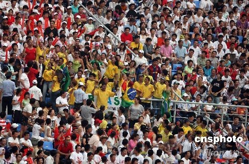 8月10日,北京奥运会沈阳足球分赛场举行男足预赛,因中国队、巴西队分别出战,场内坐无虚席。中新社发 张宇 摄