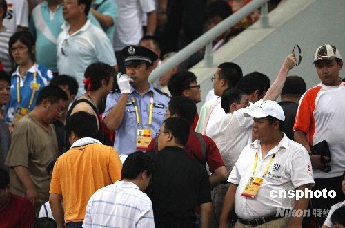 图为中国队失两球,少两名队员的情况下,球迷提前退场。中新社发 张宇 摄