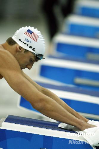 图:菲尔普斯细心擦拭跳台 200米自由泳轻松晋级