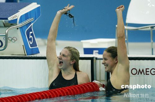 8月11日,北京奥运会女子400米自由泳,英国选手丽贝卡 ·阿德林顿以4分3秒22的成绩获得冠军(左),队友乔安妮·杰克逊(右)以4分3秒52获得铜牌。中新社发 杜洋 摄