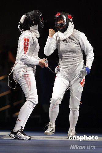 8月11日,北京奥运会女子花剑个人1/32决赛在北京国家会议中心击剑馆举行,代表加拿大出战的“击剑妈妈”栾菊杰(右)以13:9的成绩战胜突尼斯选手伊娜·布贝克里,成功晋级。 中新社发 盛佳鹏 摄