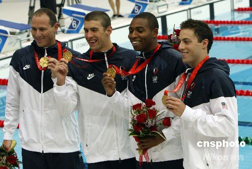 8月11日,美国队夺得北京奥运会男子4x100米自由泳接力金牌,并打破该项目世界纪录。 中新社发 杜洋 摄