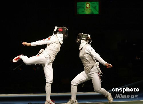 8月11日,北京奥运会女子花剑个人1/16决赛在北京国际会议中心击剑馆举行,中国选手苏婉文(左)以15:7战胜美国选手埃米莉·克罗斯,成功晋级。图为 双方在场上拼杀的动作颇似芭蕾舞蹈。中新社发 盛佳鹏 摄