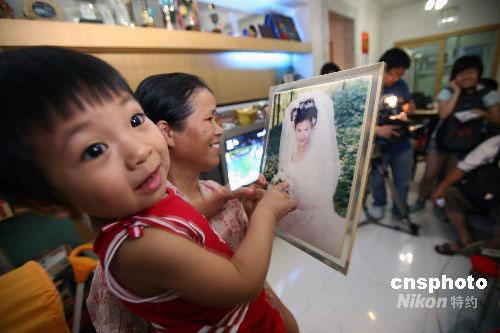 小佳慧刚满四个月,冼东妹就离开女儿回到柔道训练场。这次在电视上看见妈妈获胜,小佳慧显得很高兴,紧紧地抱着妈妈的婚纱照准备给妈妈一个飞吻。中新社发 夏世焱 摄