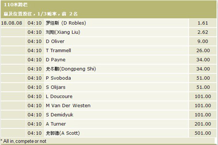 而从单项金牌博彩公司开出的赔率看来,中国军团在乒乓球、羽毛球和跳水等传统强势项目上均位列第一。至于备受关注的男子110米栏,不同博彩公司就有了差异。如易胜博等仍将刘翔排在首位,赔率为1.8左右,但立博等博彩公司则更看好古巴小将罗伯斯,赔率为1.6左右,低于刘翔的2.6。
