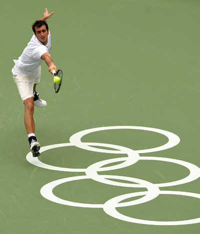 8月11日,在北京奥运会网球男单首轮比赛中,西班牙选手拉斐尔·纳达尔以2比1战胜意大利选手波蒂托·斯塔拉切。王毓国 摄