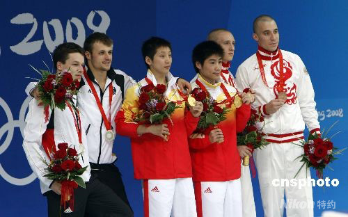 8月11日,中国“月亮组合”林跃(右)、火亮首次亮相奥运大赛,获得北京奥运会男子10米双人跳台跳水金牌。这是当天中国代表团获得的首枚金牌,也是中国代表团在本届奥运会上获得的第七枚金牌。林跃1991年出生,籍贯广州潮州。火亮出生于1989年,来自上海跳水队。 中新社发 杜洋 摄