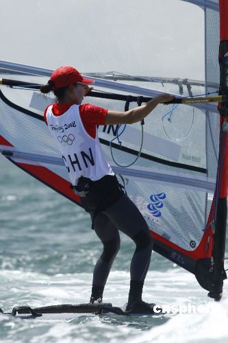 8月11日下午,奥帆赛尼尔级帆板开赛,在刚刚结束的帆船女子帆板第02轮中,中国选手殷剑获得第一名。 中新社发 周青先 摄