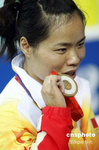 8月11日,北京奥运会开赛以来的第三天,女子举重58公斤级的决赛在北京航空航天大学体育馆拉开战幕。中国选手陈艳青表现出色,她以总成绩244公斤成功卫冕该项目冠军。陈艳青打破该项目挺举和总成绩两项奥运会纪录,也成为女子举重历史上第一位蝉联奥运会金牌的选手。 中新社发 盛佳鹏 摄