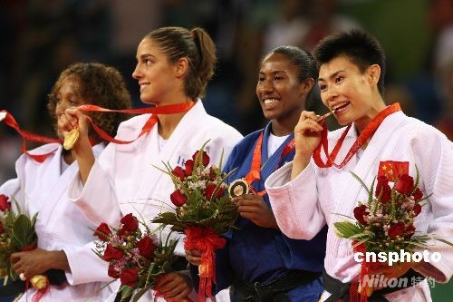 8月11日,中国选手许岩在北京奥运会女子57公斤级柔道比赛中战胜法国选手阿雷尔,夺得铜牌。中新社发 武仲林 摄