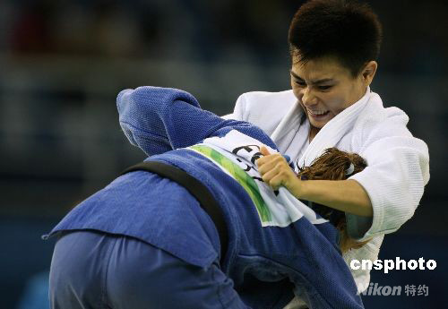8月11日,中国选手许岩(左)在北京奥运会女子57公斤级柔道比赛中战胜法国名将阿雷尔,夺得铜牌。 中新社发 武仲林 摄