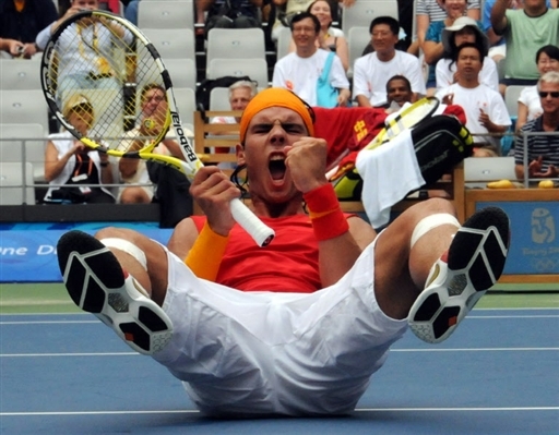 8月11日,在北京奥运会网球男单首轮比赛中,西班牙选手拉斐尔·纳达尔以2比1战胜意大利选手波蒂托·斯塔拉切。在胜利后“纳豆”显得兴奋异常