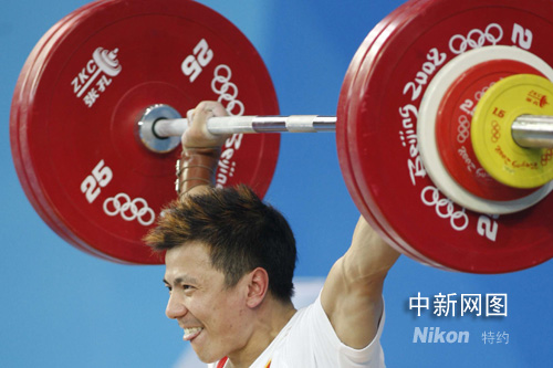 月11日,在北京奥运会举重男子62公斤级比赛中,中国选手张湘祥赢得金牌。中新社发 盛佳鹏 摄