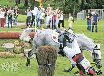 奥运马术三项赛的越野障碍赛11日早8时在上水双鱼河举行,吸引近1万名观众入场。其中,中国首名参加奥马的18岁选手华天,在日前盛装舞步赛环节中排名31,成绩紧随三项赛六朝元老托德之后。但11日越野赛中,华天跨越于8号“雨花台”障碍栏时,他策骑的马“武松”前脚碰到障碍物,马失前蹄,华天被抛落地面。