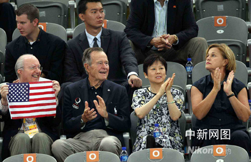 8月12日上午,北京奥运会男子体操团体决赛在国家体育馆举行,中国男队以预赛第一的成绩开始向金牌冲击。美国前总统布什夫妇在美国驻华大使雷德陪同下前来观看。中新社记者 任晨鸣 摄