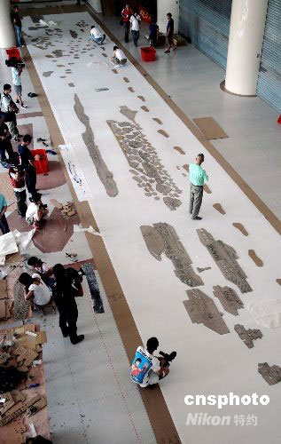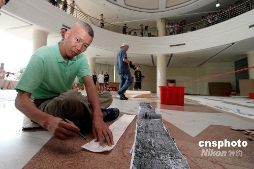 八月十二日上午,世界著名华裔艺术家、北京奥运会视觉特效艺术总设计蔡国强先生在福建泉州准备他的又一新作。这次蔡国强要把在北京奥运会开幕式上令世界人民印象深刻的古今同步、跨越时空“二十九个脚印”呈现在家乡人面前。中新社发 傅丹丹 摄