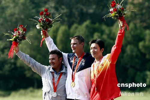 8月12日,在男子飞碟双多向比赛中,美国选手埃勒夺冠中国选手胡斌渊获铜牌。