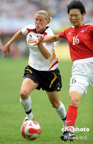 8月12日下午,奥运女足小组赛进行到第三轮,朝鲜女足和德国队的较量在天津“水滴”体育场进行,亚洲冠军朝鲜队和世界冠军德国之间为出线一决胜负,上半时双方0:0踢平。图为德国队2号克里斯汀.萨特格曼与朝鲜队16号孔慧玉在拼抢。 中新社发 陈文 摄