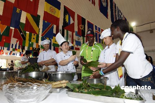 8月12日,前来参加北京奥林匹克青年营的外国营员正在学包粽子。中新社发 王东明 摄