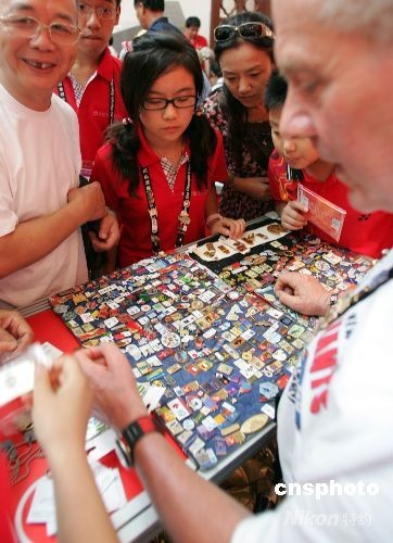 8月12日,众多“国际级”纪念章收藏者在北京奥林匹克博览会上摆摊儿,与前来欢享北京奥运会的世界各地体育迷交换体育纪念章。象征着友谊的纪念章在奥林匹克的节日里——只换,不卖。中新社发 杨可佳 摄