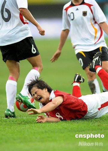 图为朝鲜队8号吉善喜场上苦战德国队。
