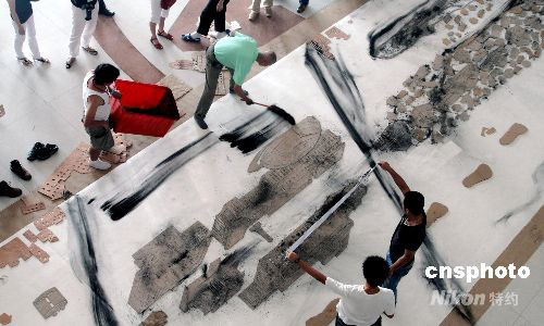 图为蔡国强在爆破前以扫走为笔进行最后绘制。 中新社发 傅丹丹 摄