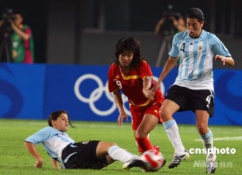 8月12日晚,奥运女足小组赛第三轮赛事展开,中国女足对阵阿根廷队。第50分钟,中国队右路起球,阿根廷门将出击失误没摘到球,韩端与对方防守球员碰撞中把球打进了球门。中新社发 刘新 摄